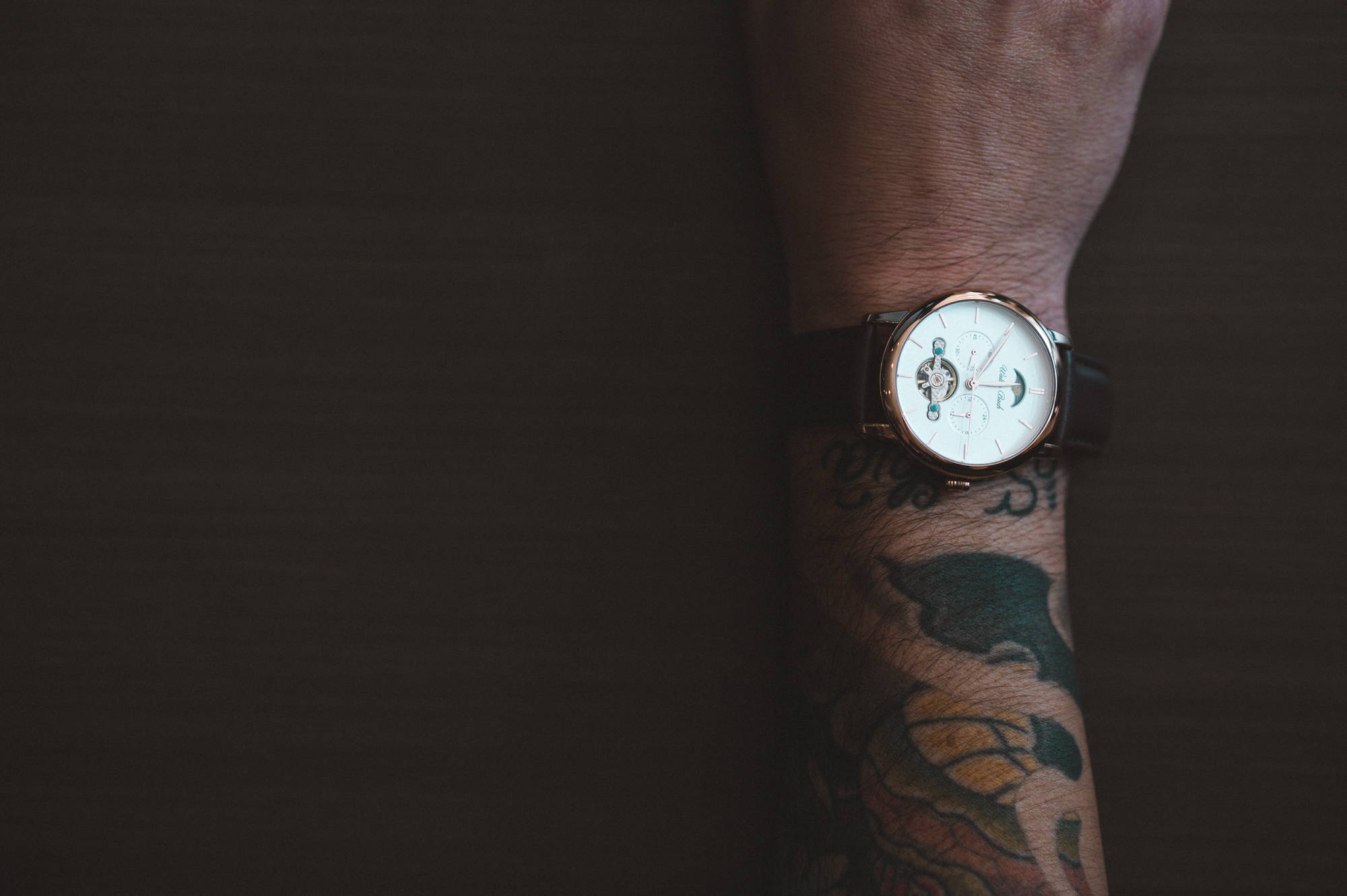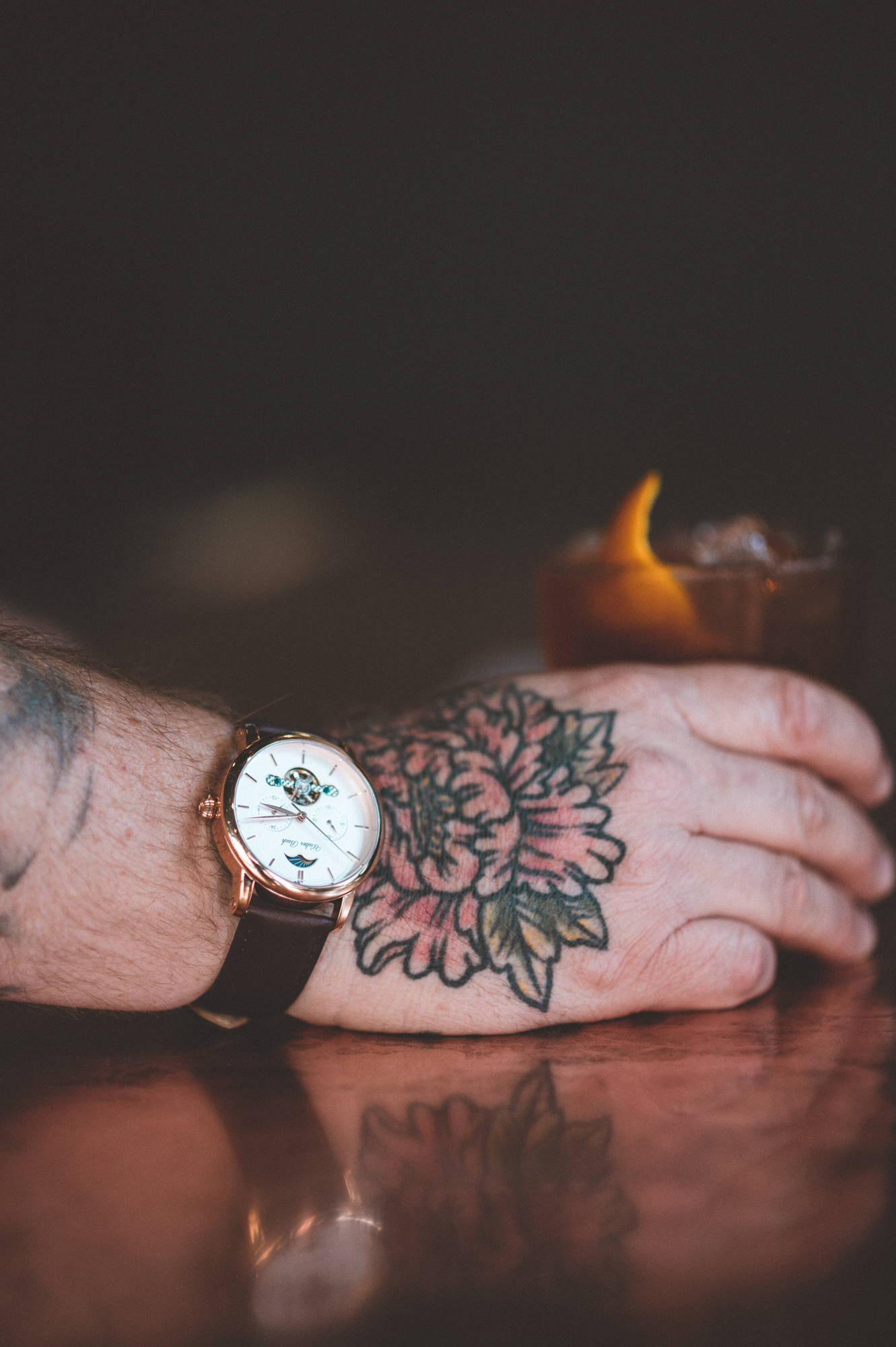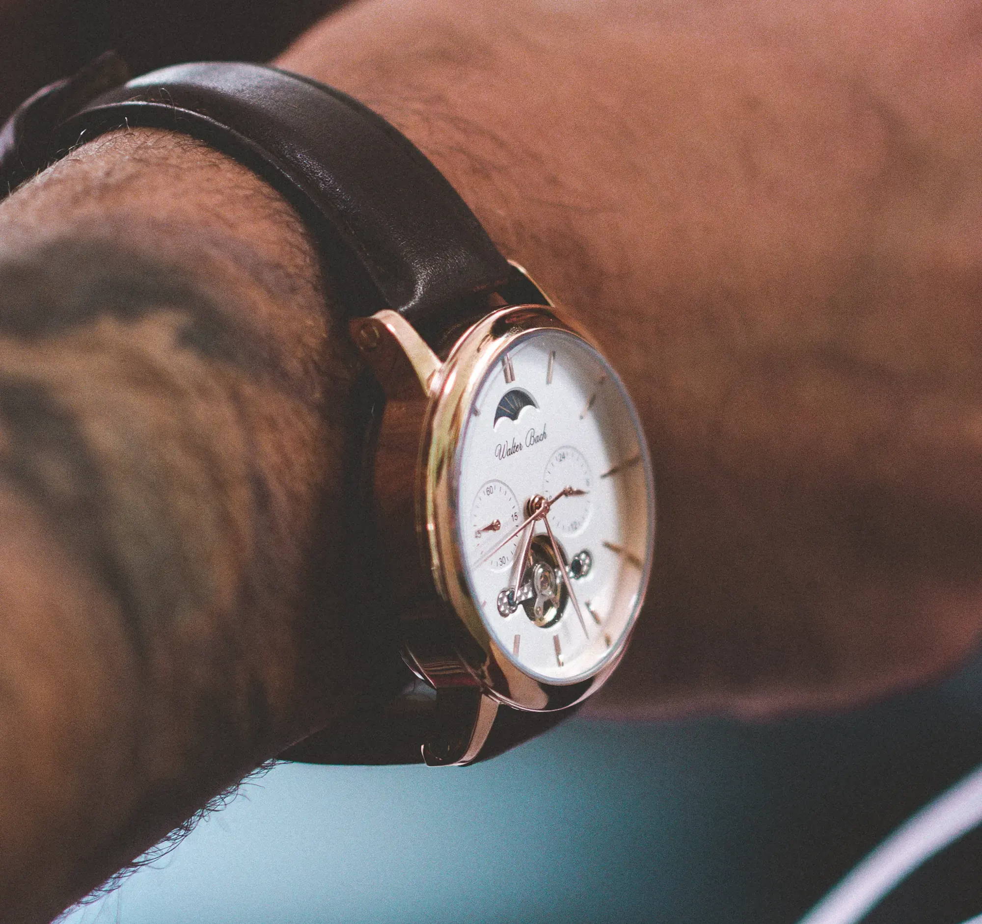 With genuine dark brown leather from the historic town of Dinkelsbuhl in Germany, this watch is nothing short of a complete wardrobe upgrade. The rose gold finish gives a timeless look that will pair well with practically any outfit you can create, and the anti-scratch sapphire coated crystal face and stainless steel clasp ensure this will be an accessory you'll have for the long haul. Take your time and use it.