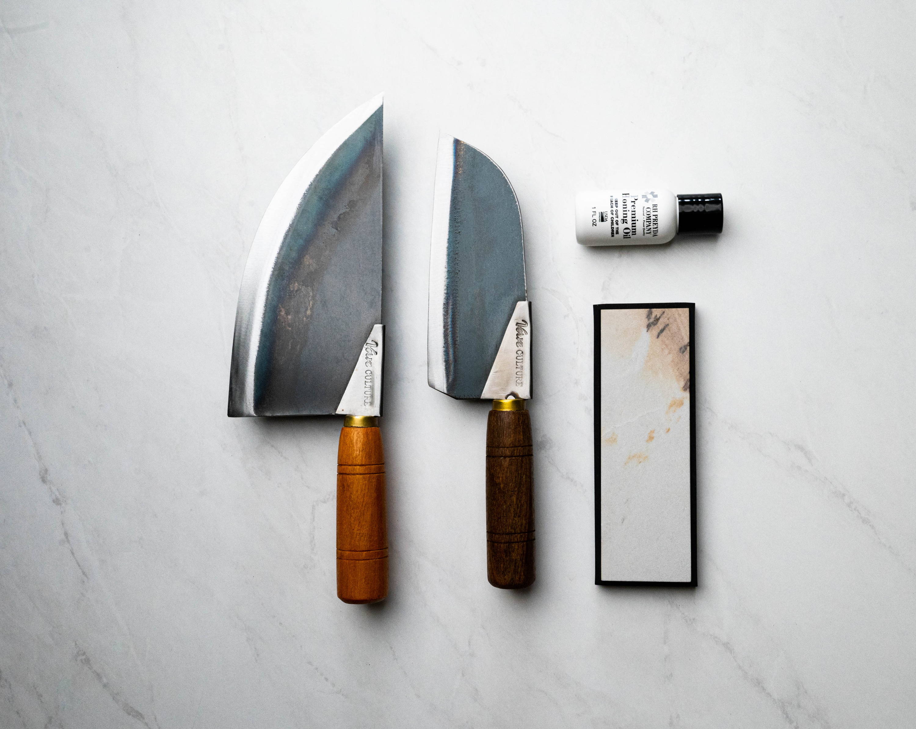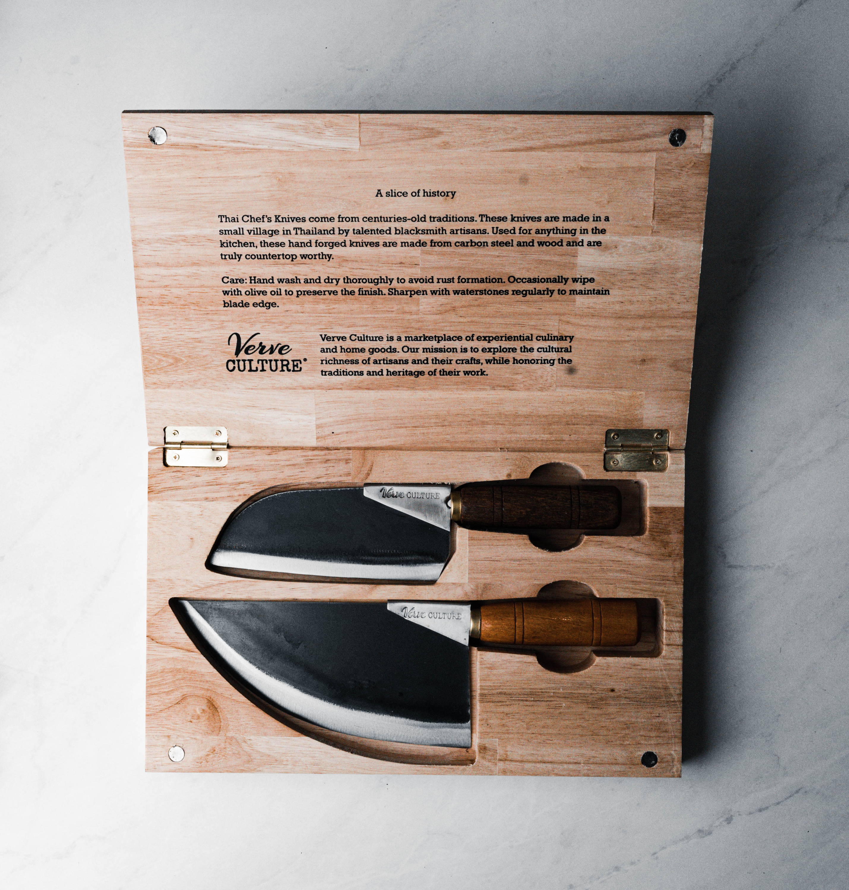 Use the lightweight carbon steel Moon Knife for longer cuts like watermelon or sirloin. The straight edged Slice Knife combines the duties of both a chef’s knife and a cleaver for precision tasks like mincing and paper-thin slicing smaller ingredients such as garlic or herbs. Each knife set fits snugly into its custom bamboo box for seamless storage.